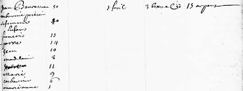 "Recensement du Canada fait par l'intendant Du Chesneau," digital images, Library and Archives Canada (https://www.bac-lac.gc.ca/eng/CollectionSearch/Pages/record.aspx?app=fonandcol&IdNumber=2318858&new=-8585855146497784530 : accessed 19 Sep 2025), household of Jean Bourasseau, 14 Nov 1681, Lauzon, page 218 (of PDF), Finding aid no. MSS0446, MIKAN no. 2318858; citing original data: Centre des archives d'outre-mer (France) vol. 460.