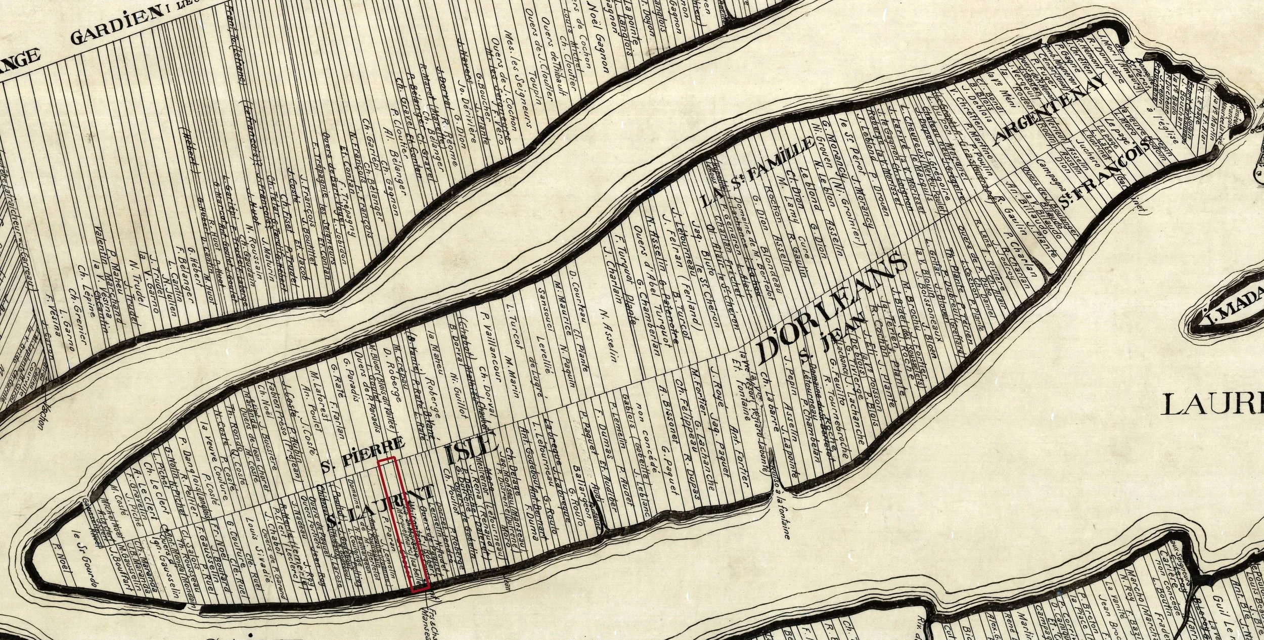 A map of Île-d’Orléans drawn up in 1709 by Gédéon de Catalogne and Jean-Baptiste Decouagne shows Adrien’s land concession, passed down to his son Marc after his death.