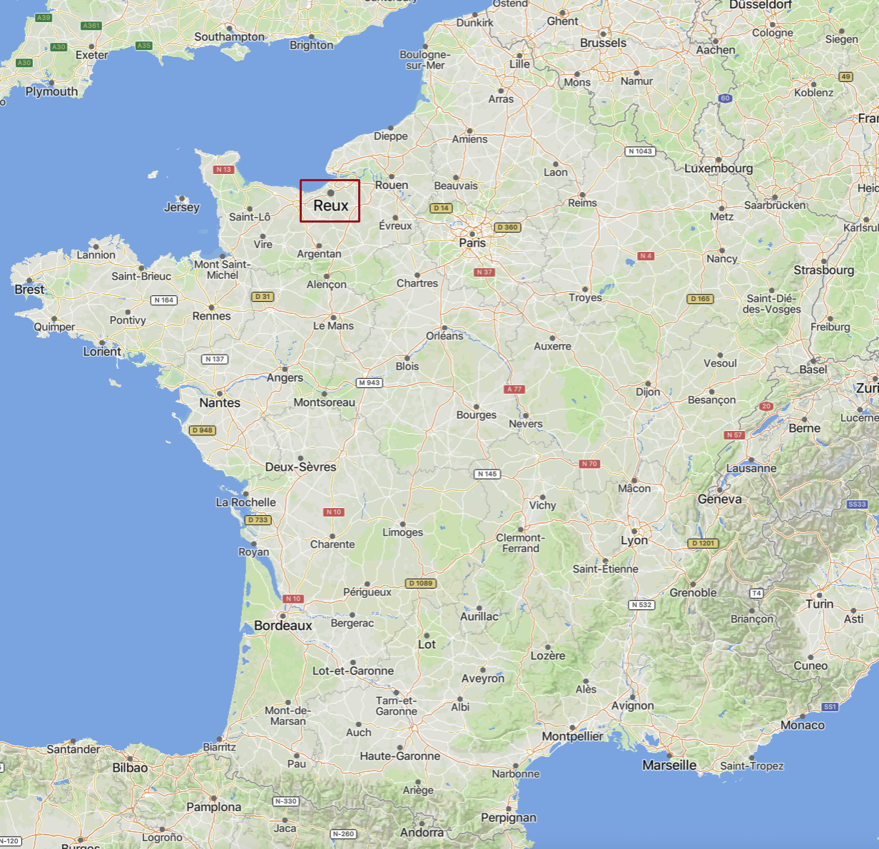 Located in the present-day department of Calvados about 70 kilometres west of Rouen, Reux is a small rural commune with fewer than 500 inhabitants, called Reuxois.