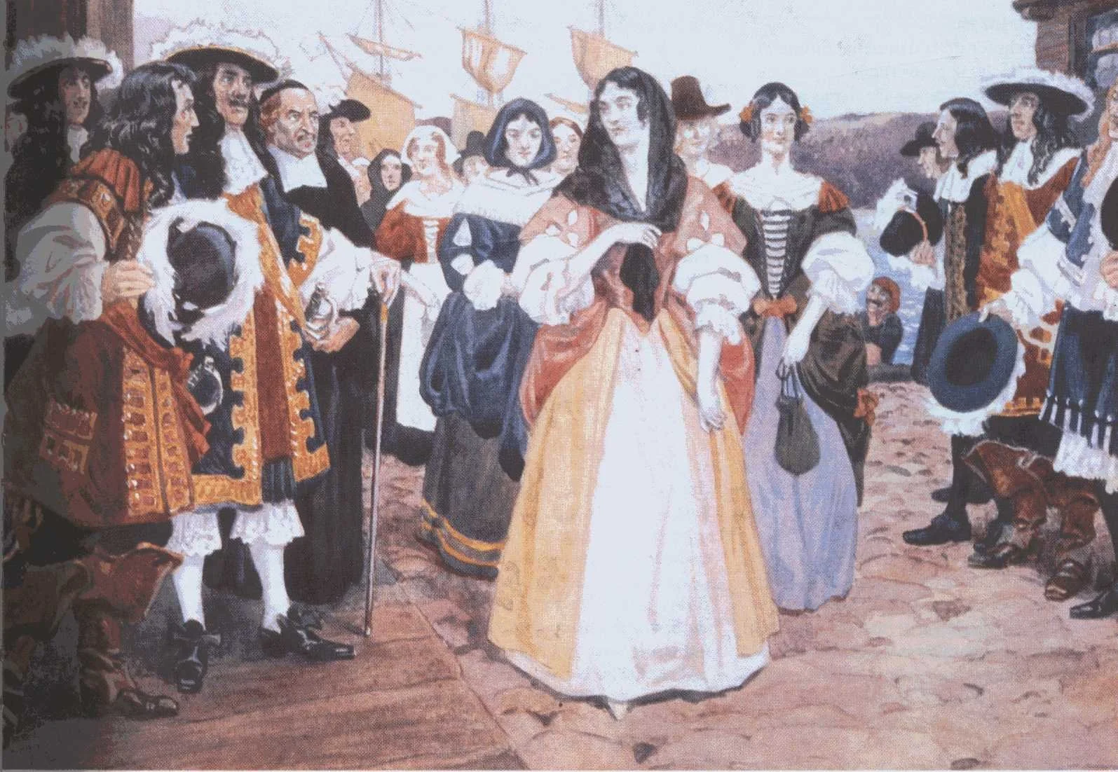 "The Arrival of the French Girls at Quebec," watercolour by Charles W. Jefferys (Wikimedia Commons)
