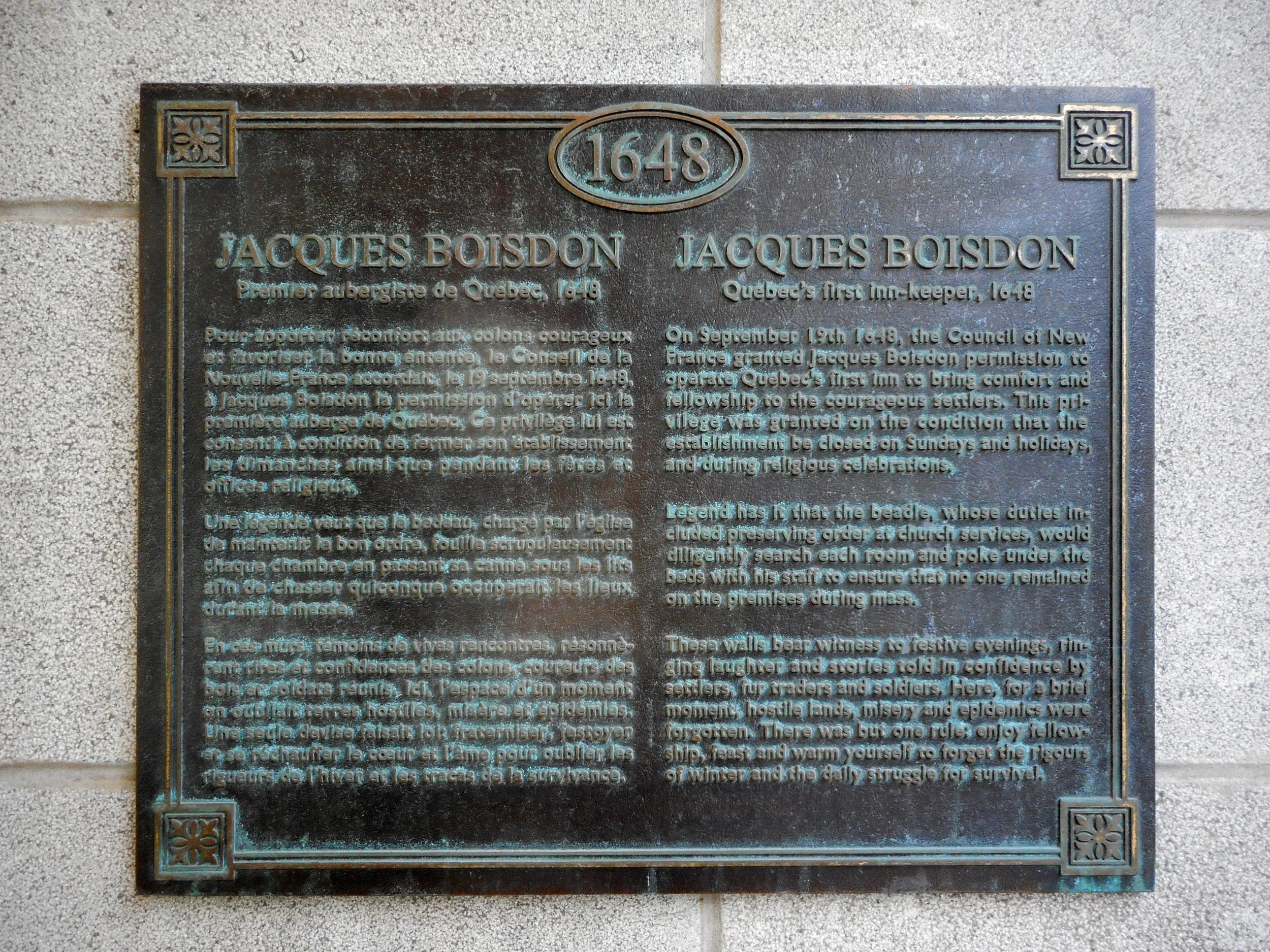 Pour apporter réconfort aux colons courageux et favoriser la bonne entente, le Conseil de la Nouvelle-France accordait, le 19 septembre 1648, à Jacques Boisdon la permission d’opérer ici la première auberge de Québec. Ce privilège lui est consenti à condition de fermer son établissement les dimanches ainsi que pendant les fêtes et offices religieux.