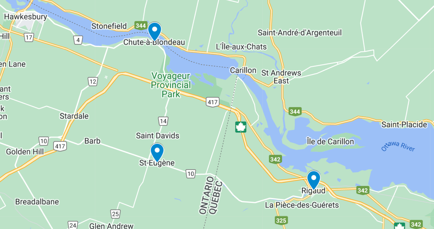 Localisation de Chute-à-Blondeau et Saint-Eugène en Ontario, et de Rigaud au Québec (Google Maps)