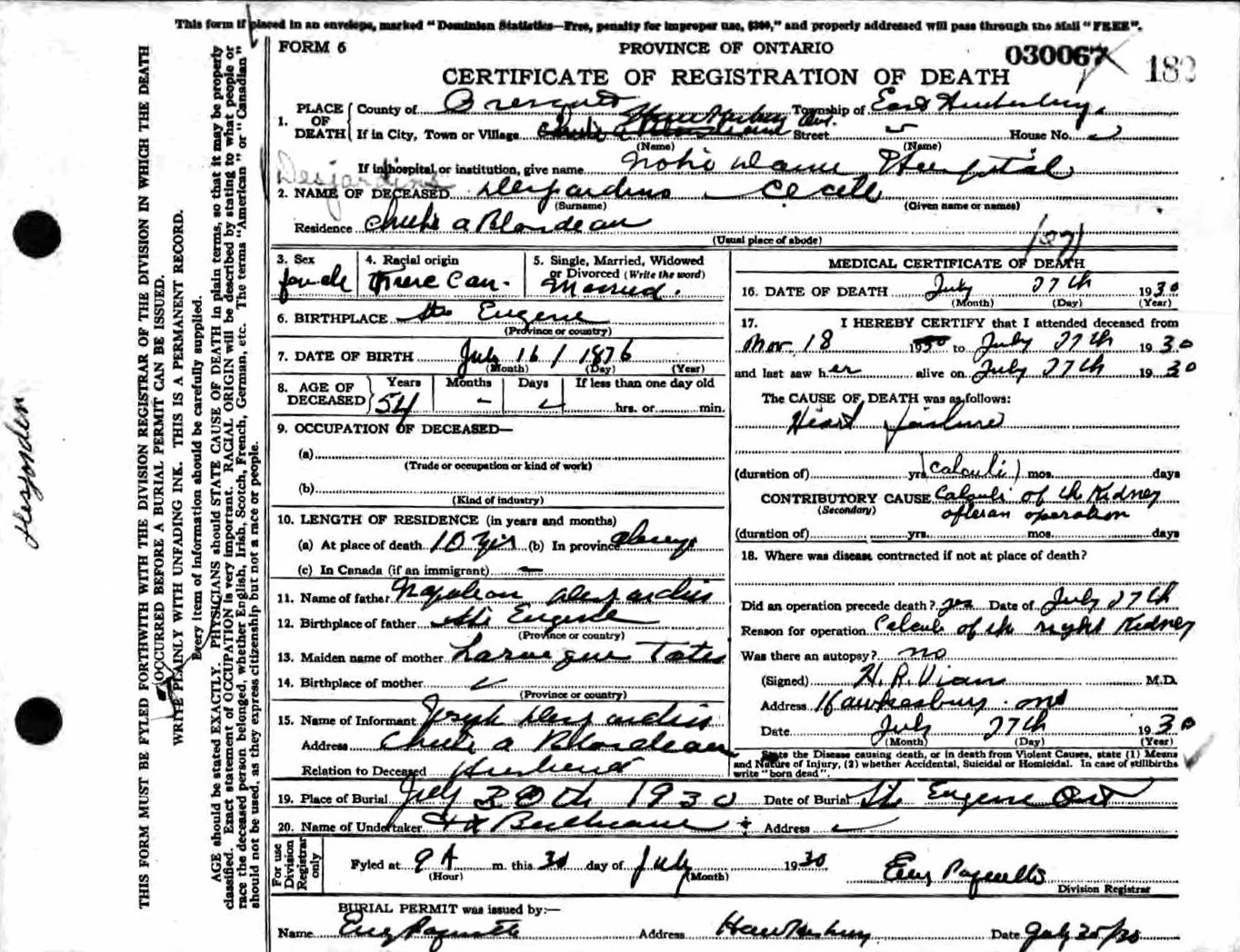 Cécile Desjardins est décédée à l’âge de 54 ans le 27 juillet 1930 à Saint-Eugène en Ontario. Elle est morte d’insuffisance cardiaque durant une opération pour calculs du rein. Cécile est inhumée à Saint-Eugène trois jours plus tard.