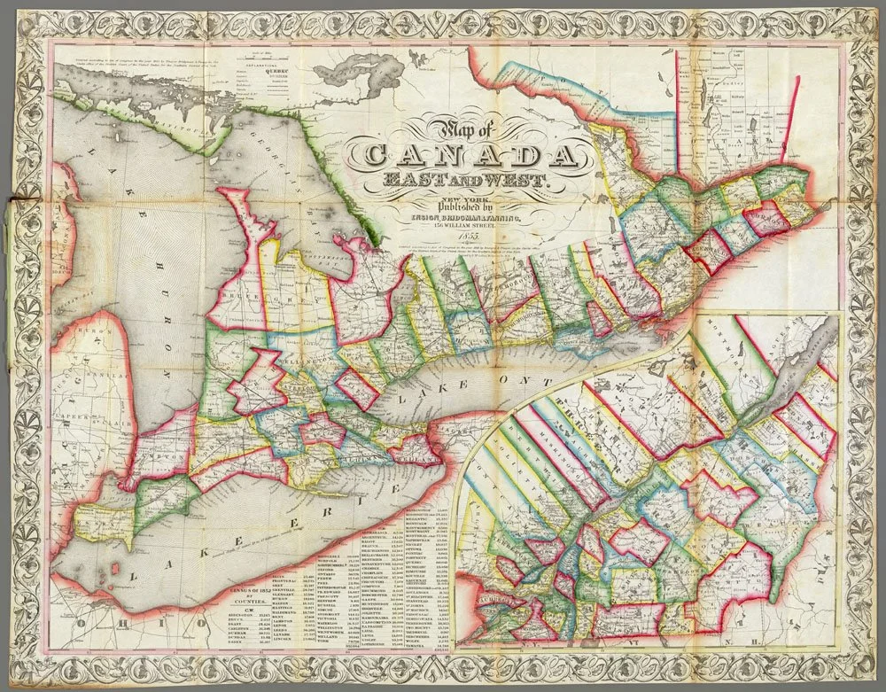 Carte de la province du Canada (comprenant le Canada-Est et Canada-Ouest) en 1855 (Bibliothèque et Archives Canada)
