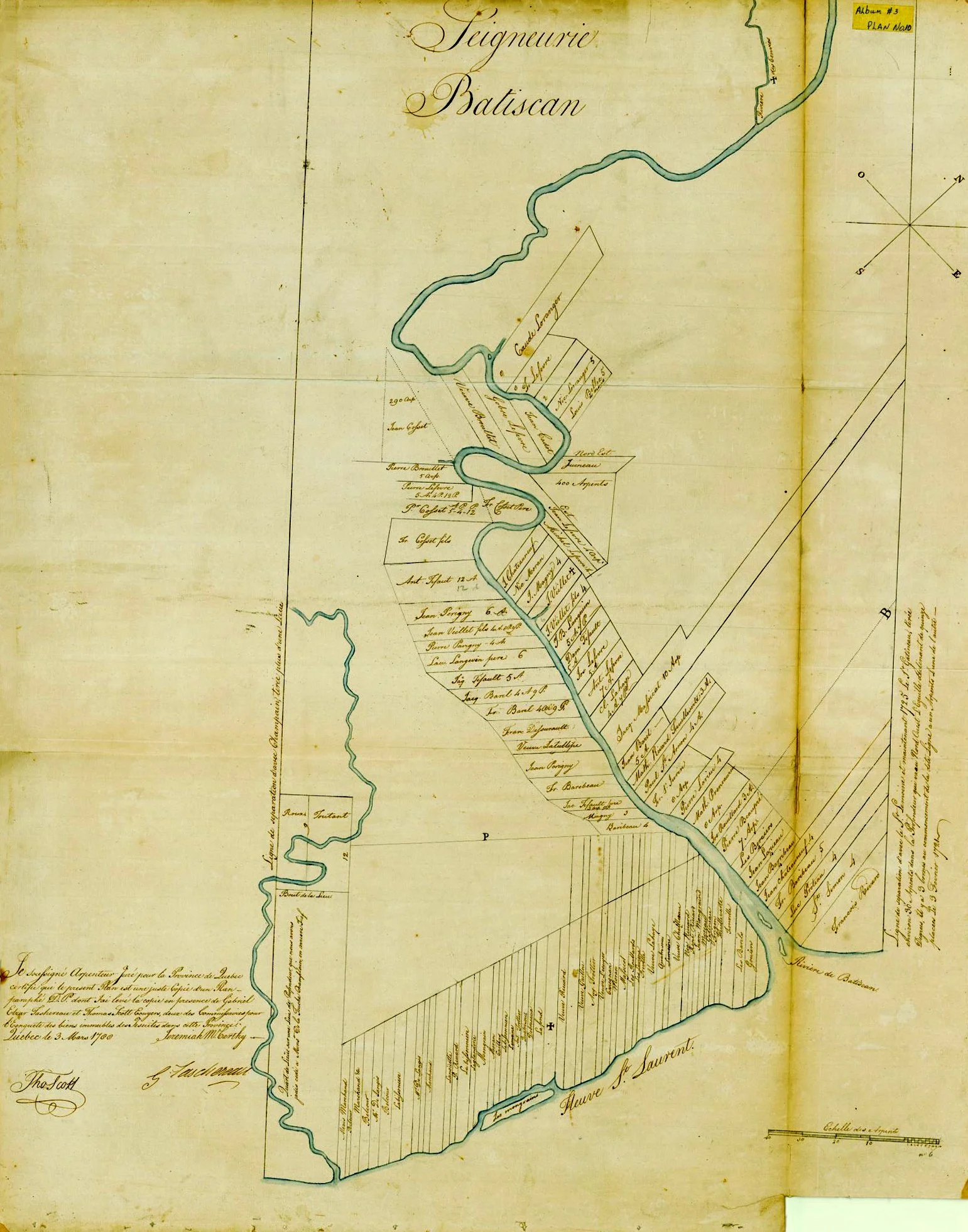 Carte de la seigneurie of Batiscan en 1721 (copie réalisée par J. McCarthy en 1788, d’après l’original de de Lanaudière, Bibliothèque et Archives nationales du Québec)