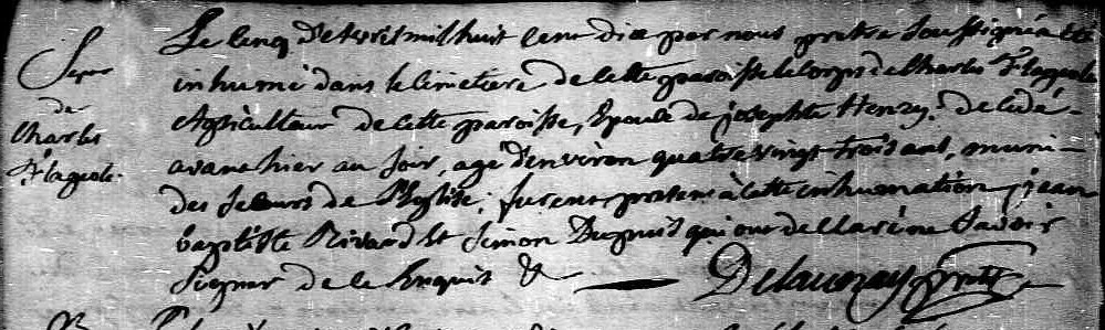 Le 5 janvier 1761, le notaire royal Nicolas Duclos rédige un contrat de mariage entre Charles « Flageol », résidant à la Rivière Batiscan dans la paroisse de Sainte-Geneviève, et Marie Josèphe Henry, également de la Rivière Batiscan. Charles est âgé d’environ 34 ans et Marie Josèphe de 21 ans. Le contrat est conforme aux normes de la Coutume de Paris. Charles dote sa future épouse d’un douaire coutumier de 600 livres. Le préciput est fixé à 300 livres. Le préciput, sous le régime de la communauté de biens entre époux, constitue un avantage accordé à l’un des conjoints—généralement le survivant—et consiste en un droit de prélèvement, lors de la dissolution de la communauté, sur certains biens déterminés ou sur une somme d’argent. Ni la mariée ni le marié ne savent signer le contrat de mariage.