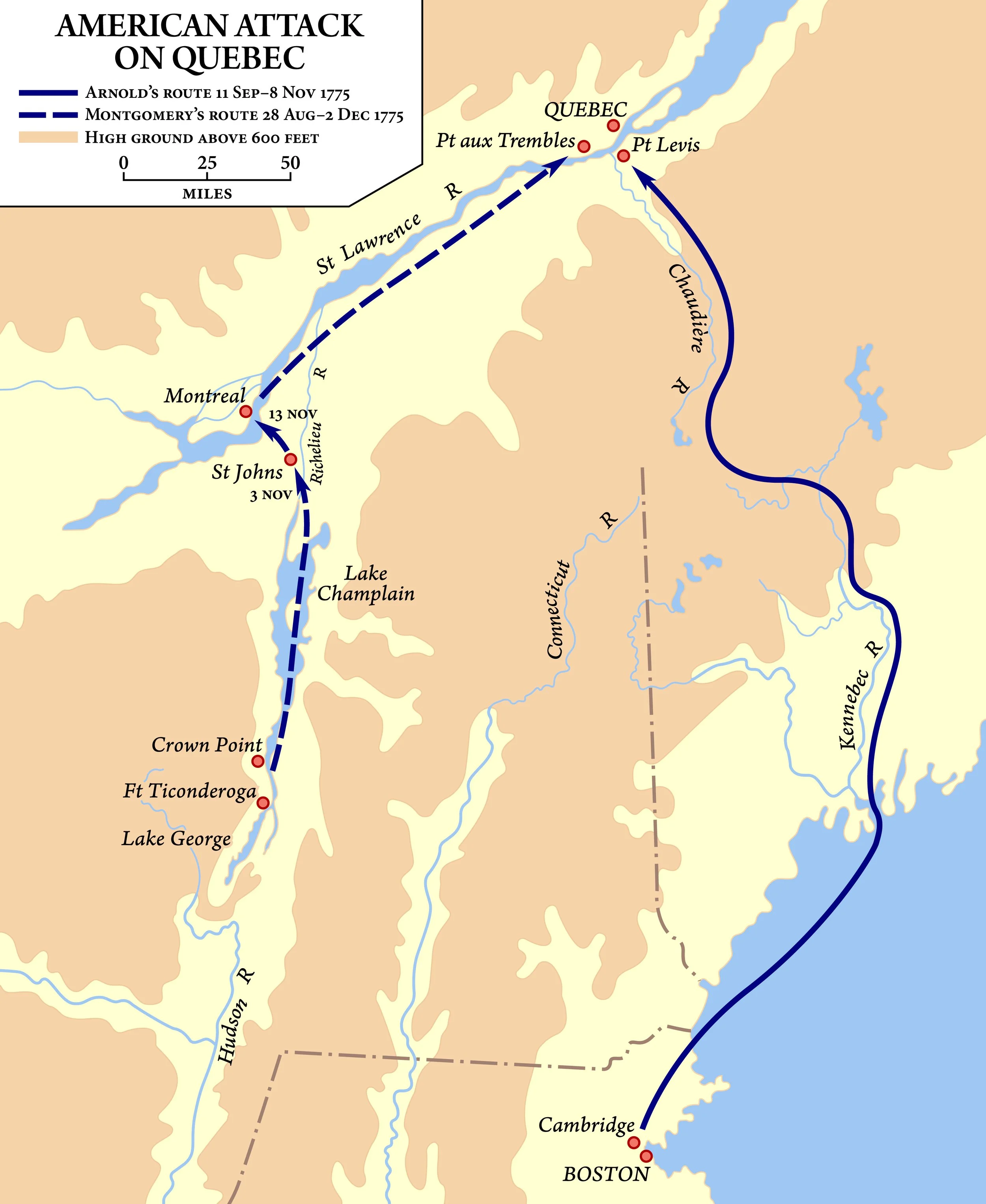 « Attaque américaine sur Québec : itinéraires des expéditions Arnold et Montgomery », United States Army Center of Military History (Wikimedia Commons)