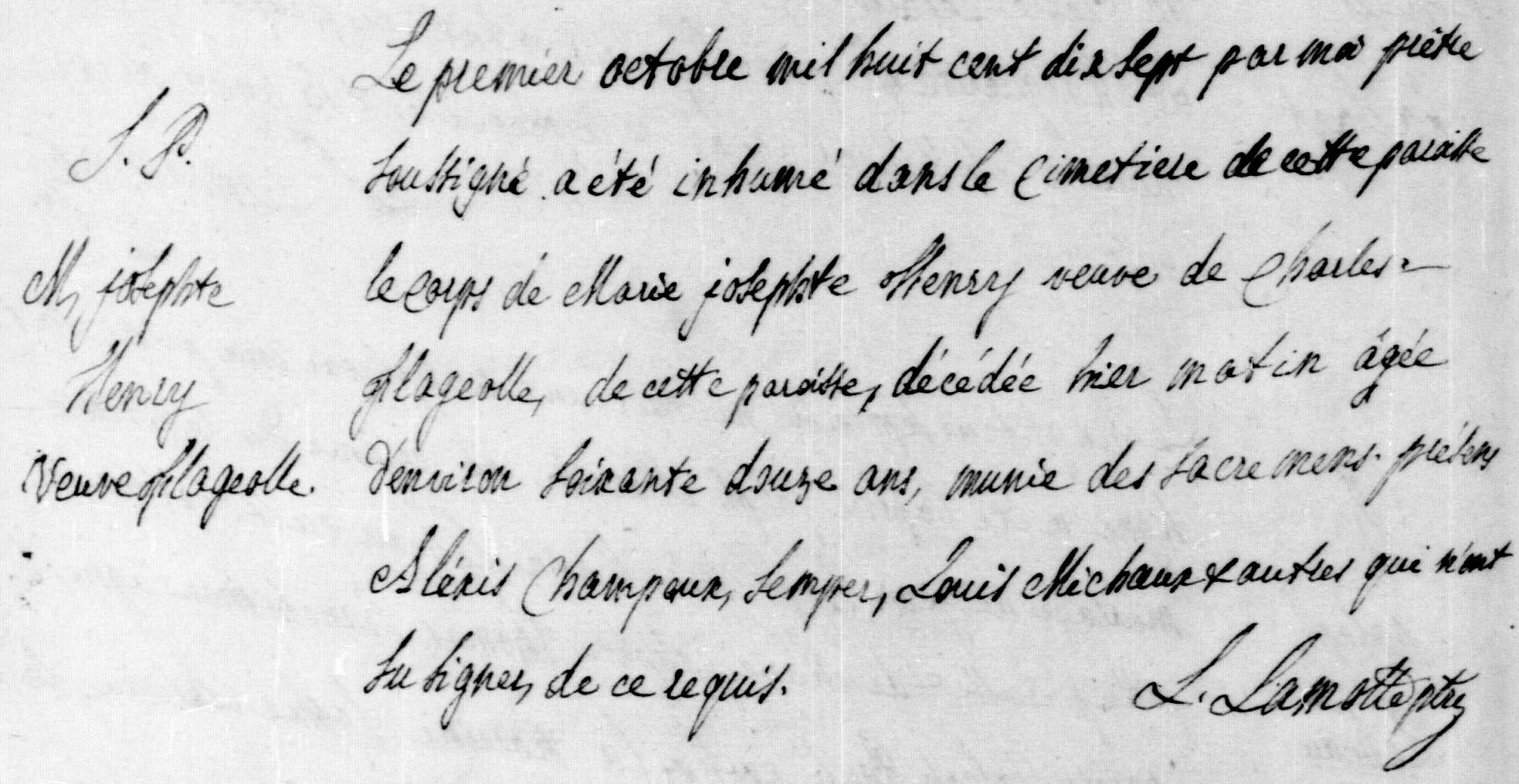 Ibid. (https://www.genealogiequebec.com/Membership/LAFRANCE/acte/2911526 : consulté le 7 juil. 2025), sépulture de Marie Josephte Henry, 1 oct. 1817, St-Cuthbert (Berthier).