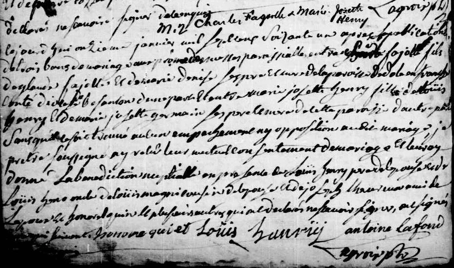 Ibid. (https://www.genealogiequebec.com/Membership/LAFRANCE/acte/269818 : consulté le 3 juil. 2025), mariage de Charles Fajolle et Marie Josephe Henry, 11 janv. 1761, Ste-Geneviève-de-Batiscan (Ste-Geneviève).