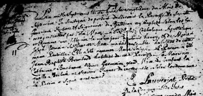 « Le LAFRANCE (Baptêmes, Mariages, Sépultures) », base de données et images numérisées, Généalogie Québec (https://www.genealogiequebec.com/Membership/LAFRANCE/acte/110128 : consulté le 3 juil. 2025), baptême de Marie Josephe Henry, 20 sept. 1739, Ste-Geneviève-de-Batiscan (Ste-Geneviève).
