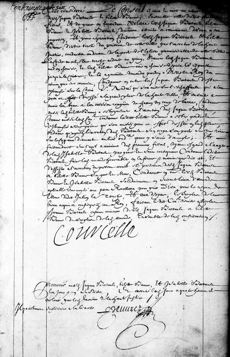 In this case, however, the sentence also included a partial remission in favour of the Bertault children. While confiscation was the rule, colonial authorities could exercise discretion to mitigate its effects, particularly where innocent dependents were concerned. Some portion of the seized property was therefore likely preserved or returned for the benefit of the minor children, Nicolas and Jacques Bertault. This reflects a pragmatic dimension of justice in New France: although punishment was severe and highly public, there remained limited scope to protect those who bore no responsibility for the crime.