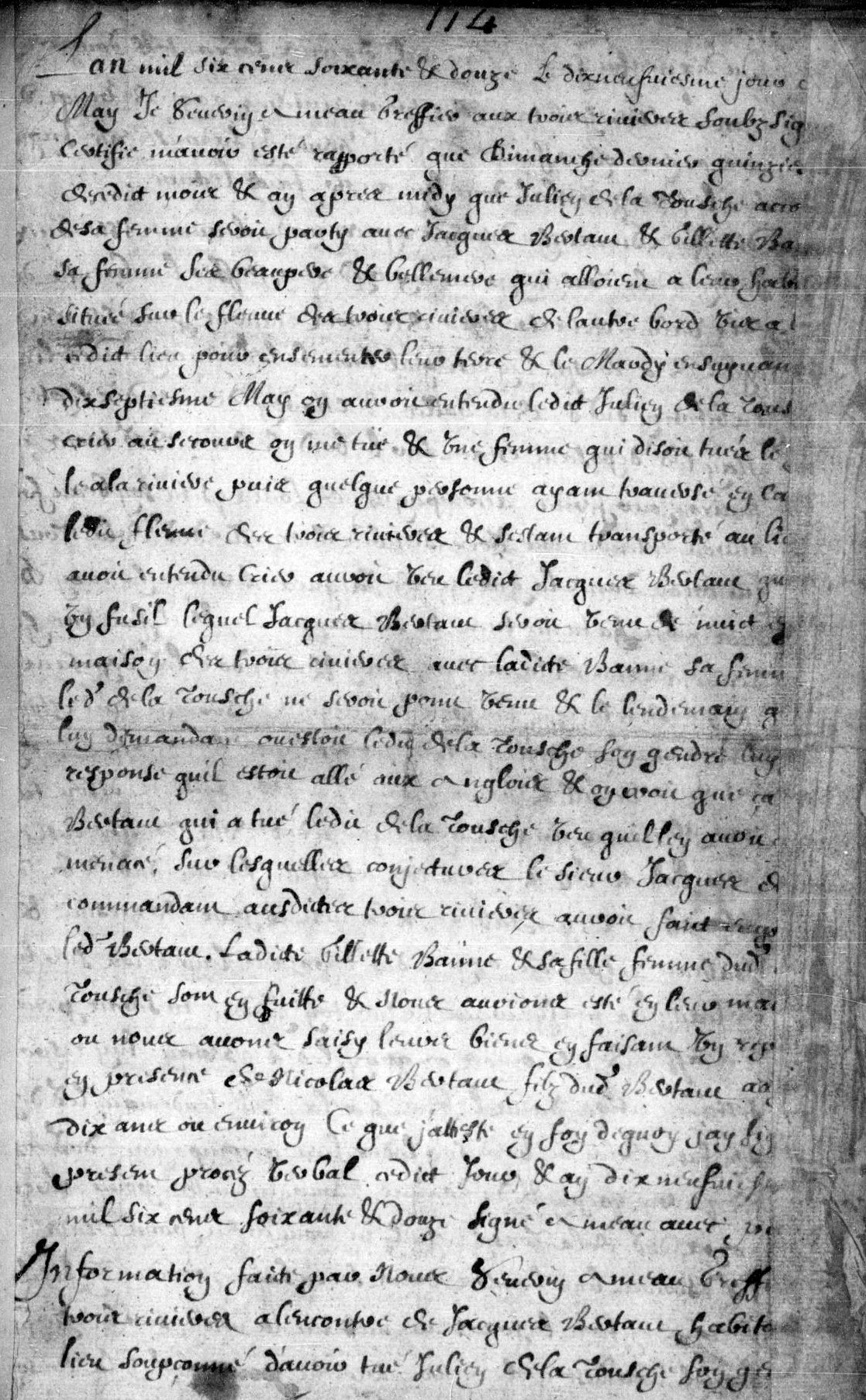 On the evening of May 17, Gauthier and Petit stated that they were on the opposite side of the river when they heard a voice resembling that of Julien Latouche crying out from Jacques Bertault’s barn. According to their testimony, the voice repeatedly declared that he was being killed and that his attacker would be hanged. They reported that these cries continued for approximately an hour and a half and were accompanied by the sound of blows. They further stated that Gillette Banne was heard urging on the violence, repeating words to the effect of “kill him.”