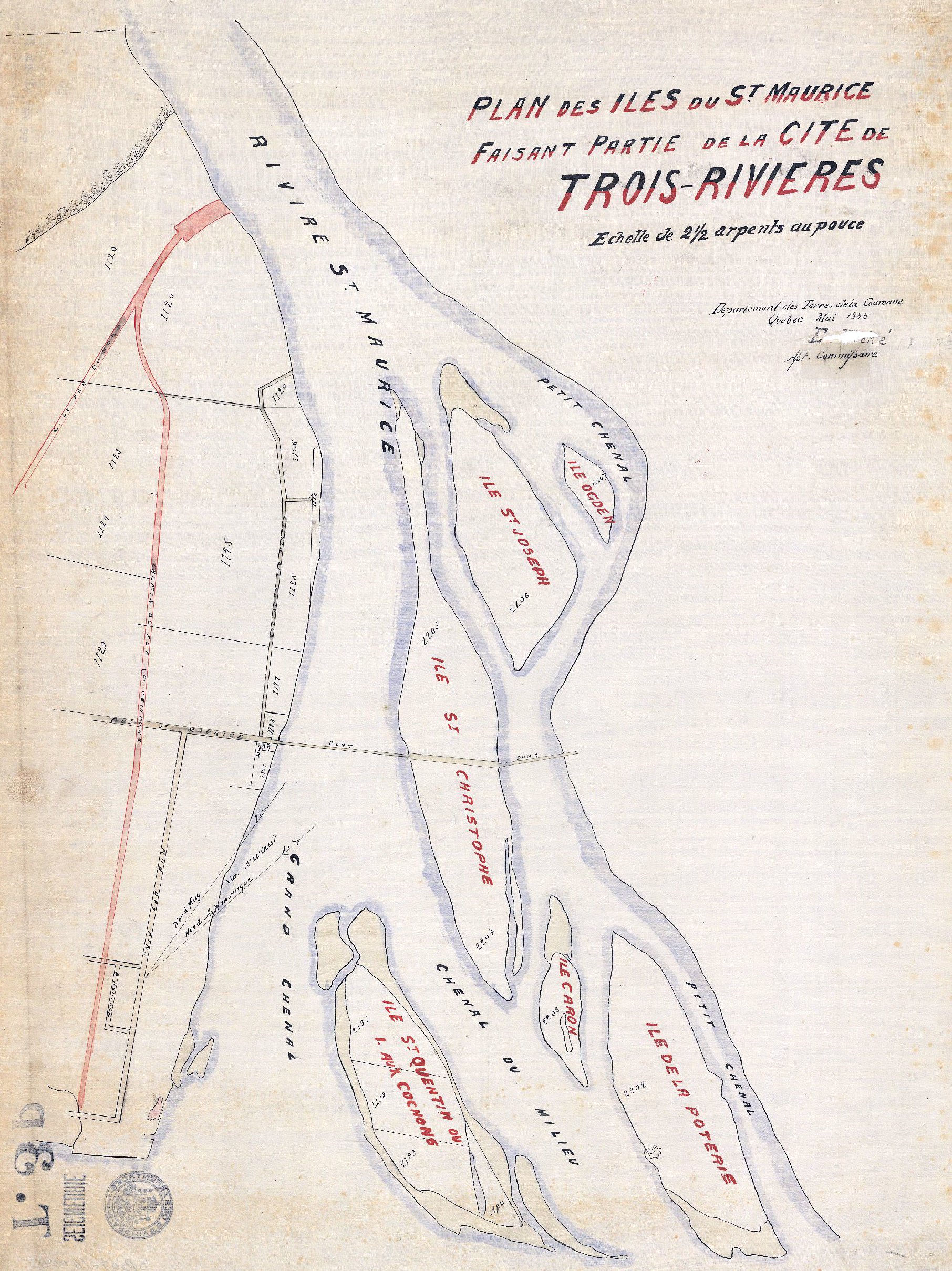 "Map of the city of Trois-Rivières showing islands and the St. Maurice River," May 1885 (Bibliothèque et Archives nationales du Québec)