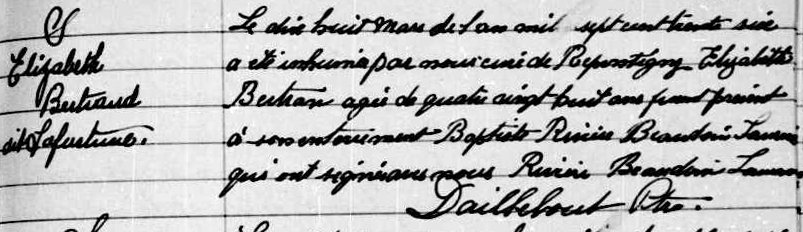 Élisabeth “Isabelle” Bertault died at the age of 77 and was buried on March 18, 1736, in Repentigny.