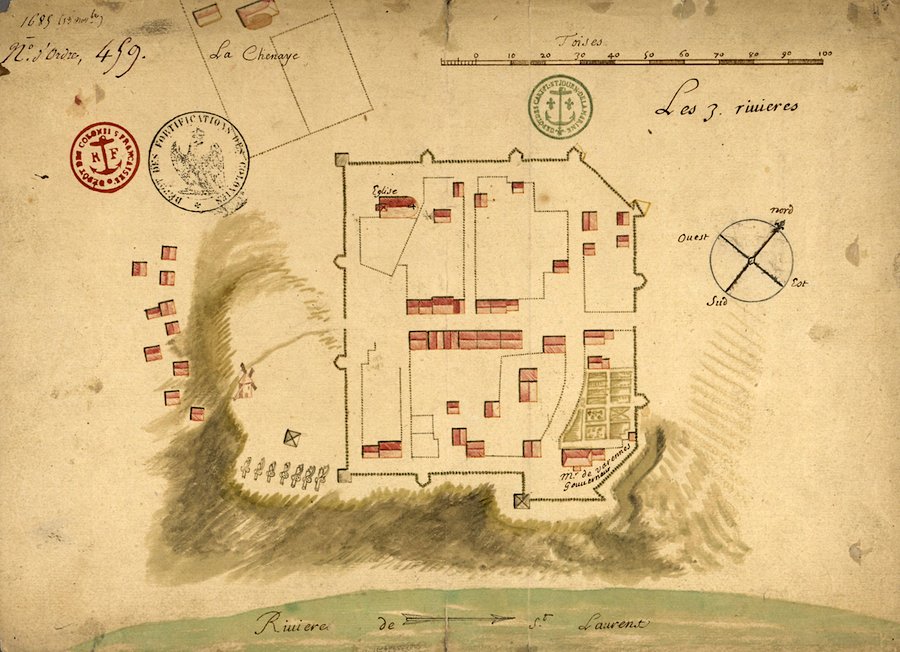 Map of Trois-Rivières in 1685; Gillette’s property would have been located in the upper-right corner of the fortified town (Wikimedia Commons)
