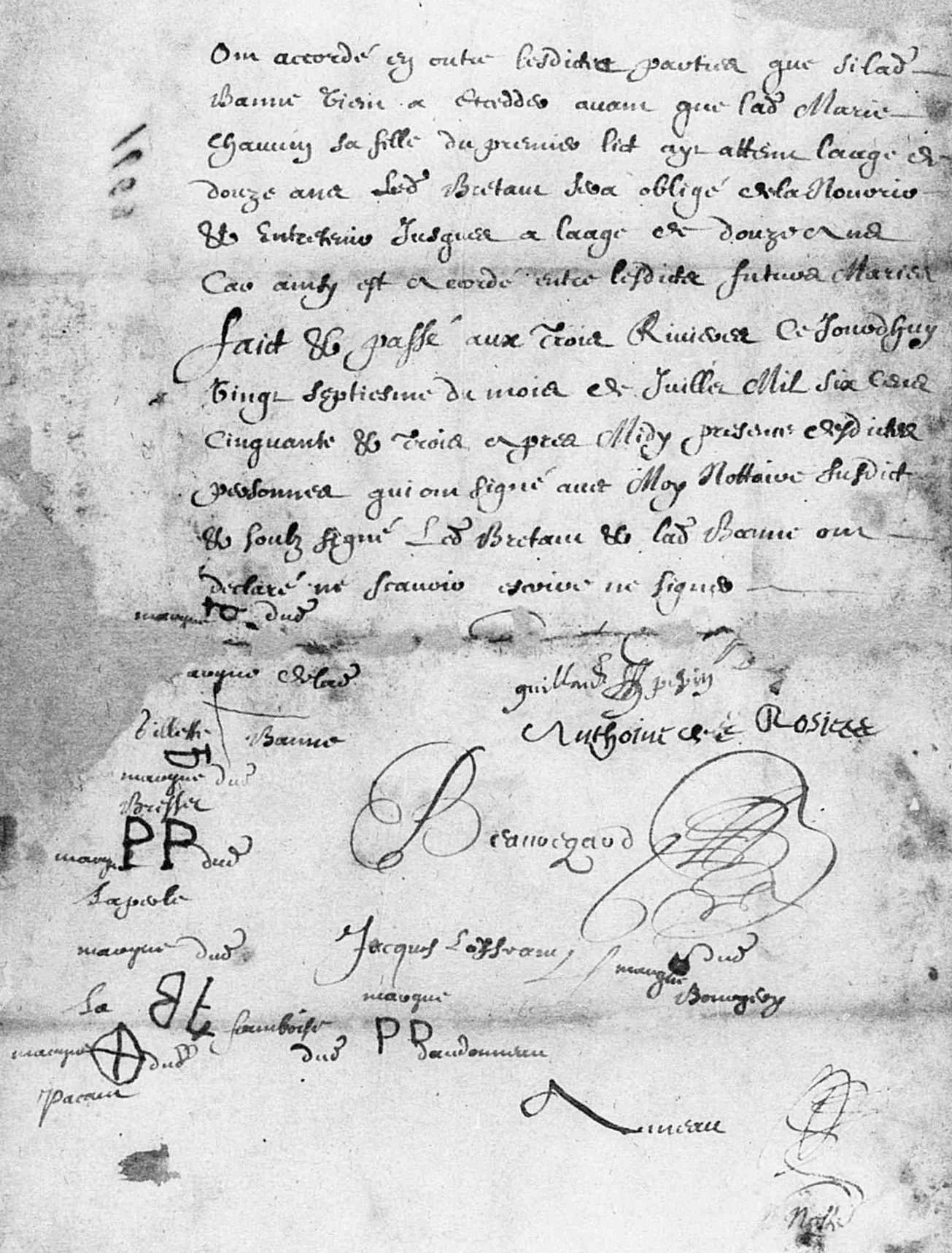 On the afternoon of July 27, 1653, notary Sévérin Ameau drew up a marriage contract between Gillette and locksmith Jacques Bertault, the son of Thomas Bertault and Catherine Colonne. He was about 27, from Les Essarts in the Poitou province of France; she was about 17. The contract stipulated that Jacques would feed and care for Marie Chauvin, Gillette's daughter from her first marriage, until she reached the age of 12. Neither bride nor groom could sign the contract. The date of their wedding is unknown, as the marriage record has not been located. Couples typically married within three weeks of signing a marriage contract.