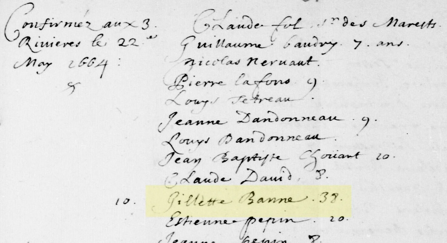"Registre des confirmations 1649-1662," digital images, Généalogie Québec (https://www.genealogiequebec.com/membership/fr/fonds-drouin/REGISTRES : accessed 23 Feb 2026), confirmation of Gillette Banne, 22 May 1664, Trois-Rivières; citing original data: Registre des confirmations, Diocèse de Québec, Registres du Fonds Drouin.