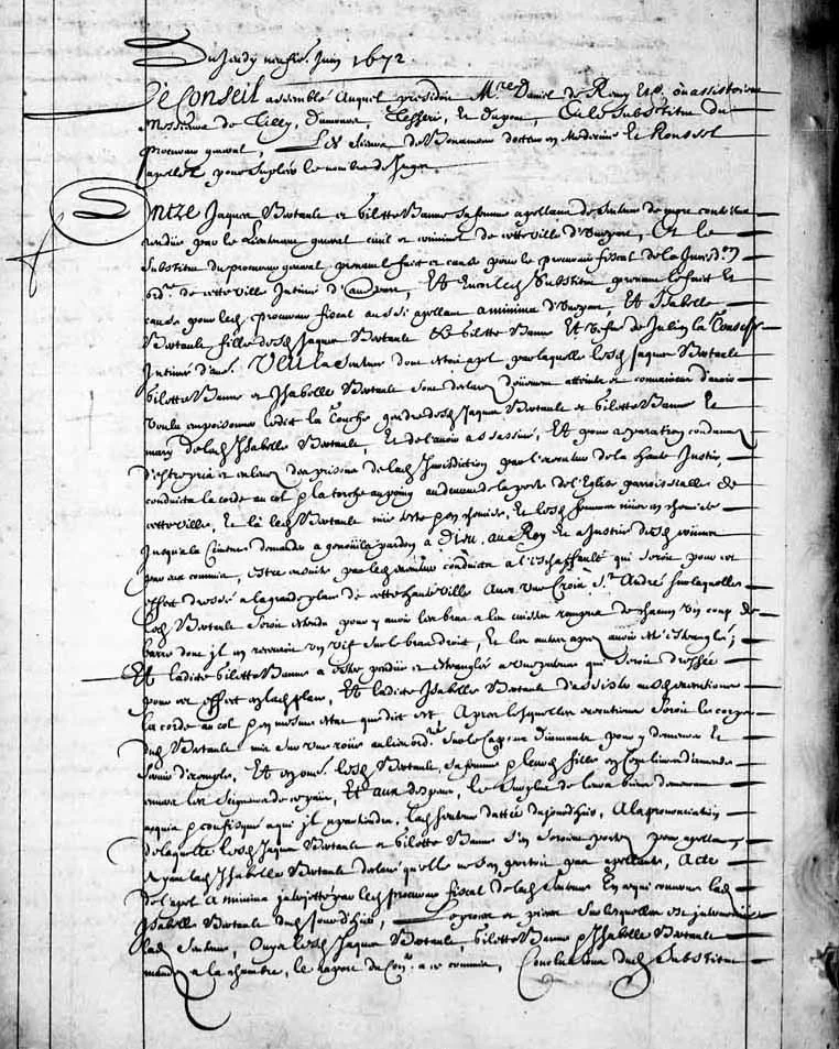 Authorities then proceeded to the Bertault residence, where they seized the family’s property in the presence of their 10-year-old son, Nicolas. On May 19, the principal witnesses—Jean Gauthier, Louis Petit, and Jean Héroux dit Bourguinville—were formally interrogated, and the clerk Séverin Ameau recorded the initial findings in a memorandum.