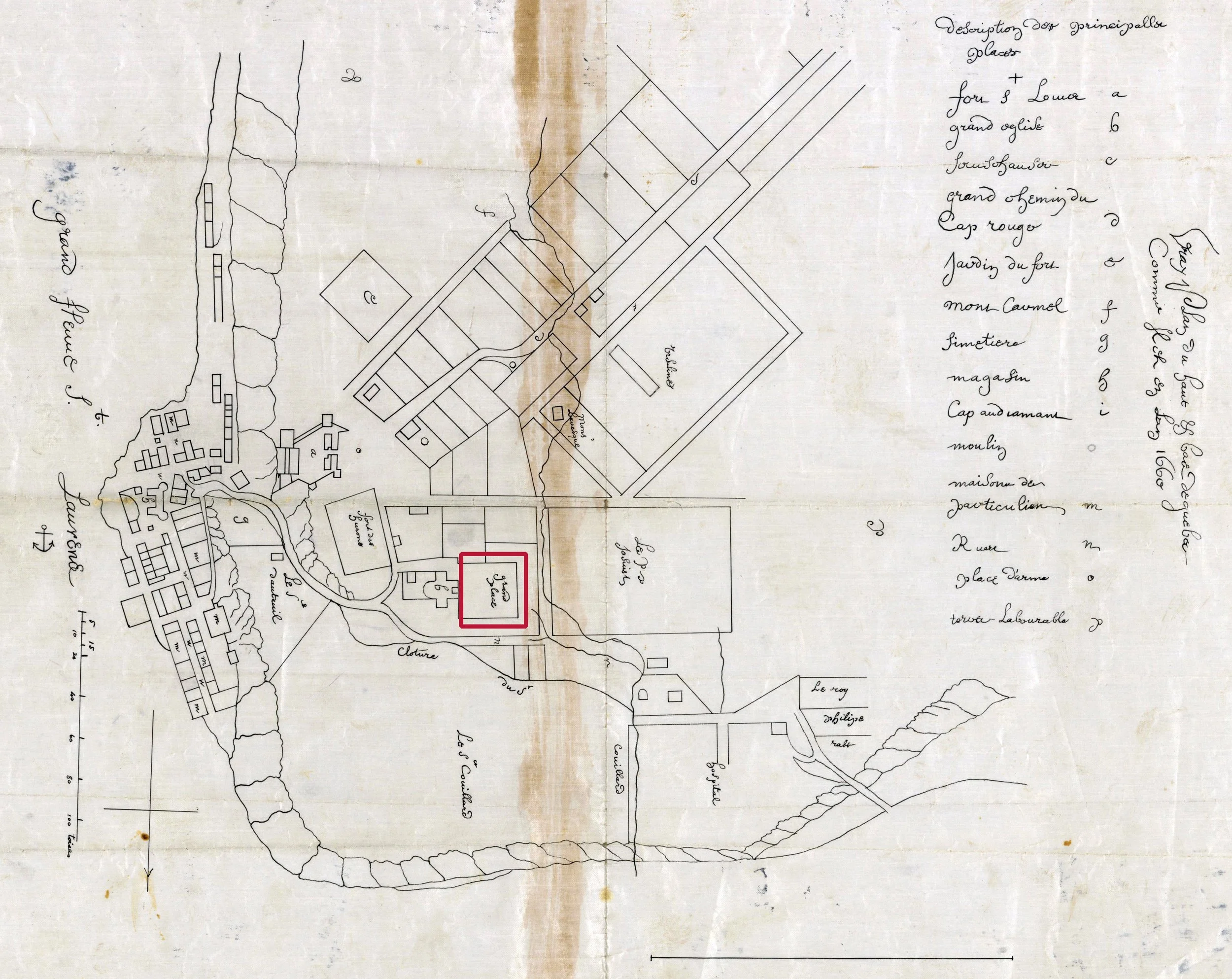 1660 map of Québec by Jean Bourdon, with the Grande Place in red (Bibliothèque et Archives nationales du Québec)