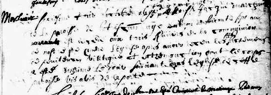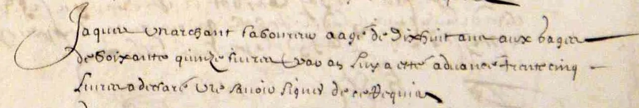 « Aujourd’hui onzième d’avril mille six cents cinquante-six, tous les ci-après nommés ont comparus par-devant Abel Cherbonnier, notaire royal en la ville et gouvernement de La Rochelle. Lesquels ont volontairement reconnu avoir demeuré d’accord avec François Peron, marchant de cette dite ville, pour ce personnellement établi, stipulant et acceptant dès lors que ledit Peron les requerra ou fera requérir de s’embarquer en le navire nommé Le Taureau audit Peron appartenant duquel est maître Élie Tadourneau pour passer, sauf les fortunes de la mer [perte ou dommage fortuitement occasionné à un navire ou à sa cargaison], au lieu de Québec, pays de Canada, pour soit audit Québec que autres endroits dudit Canada demeurer au service, fidélité et obéissance de ceux à qui celui qui aura les ordres dudit Peron leur ordonnera pour travailler ceux qui sont de métier de leur métier et eux et les autres qui ne savent de métier, à tel travail que bon semblera leur ordonner ceux à qui ils seront délaissés le temps et cours de trois années prochaines consécutives et sans intervalle qui commenceront du jour qu’ils mettront pied à terre audit Québec aux gages et salaires ci-après exprimés.