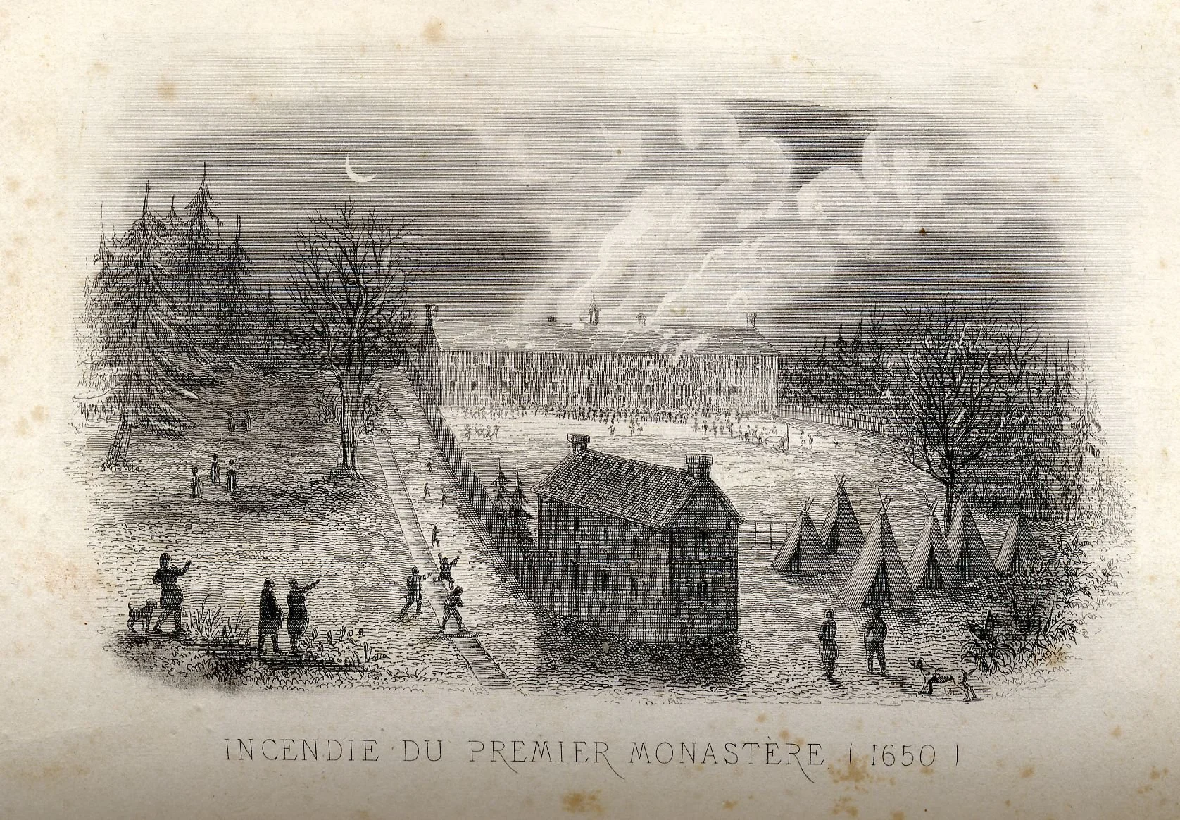 « Incendie du premier monastère (1650) », dessin de 1864 (Bibliothèque et Archives nationales du Québec)