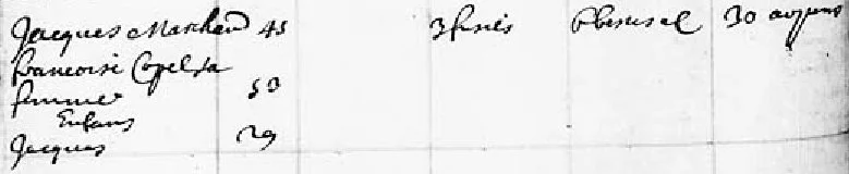 « Recensement du Canada, 1667 », Bibliothèque et Archives Canada (https://www.bac-lac.gc.ca/eng/CollectionSearch/Pages/record.aspx?app=fonandcol&IdNumber=2318857&new=-8585951843764033676 : consulté le 17 avr. 2025), ménage de Jacques Le Marchant, 1667, Petit Cap de la Magdeleine, page 86 (du PDF), Instrument de recherche MSS0446, Item 2318857 ; citant les données originales : Centre des archives d'outre-mer (France) vol. 460.