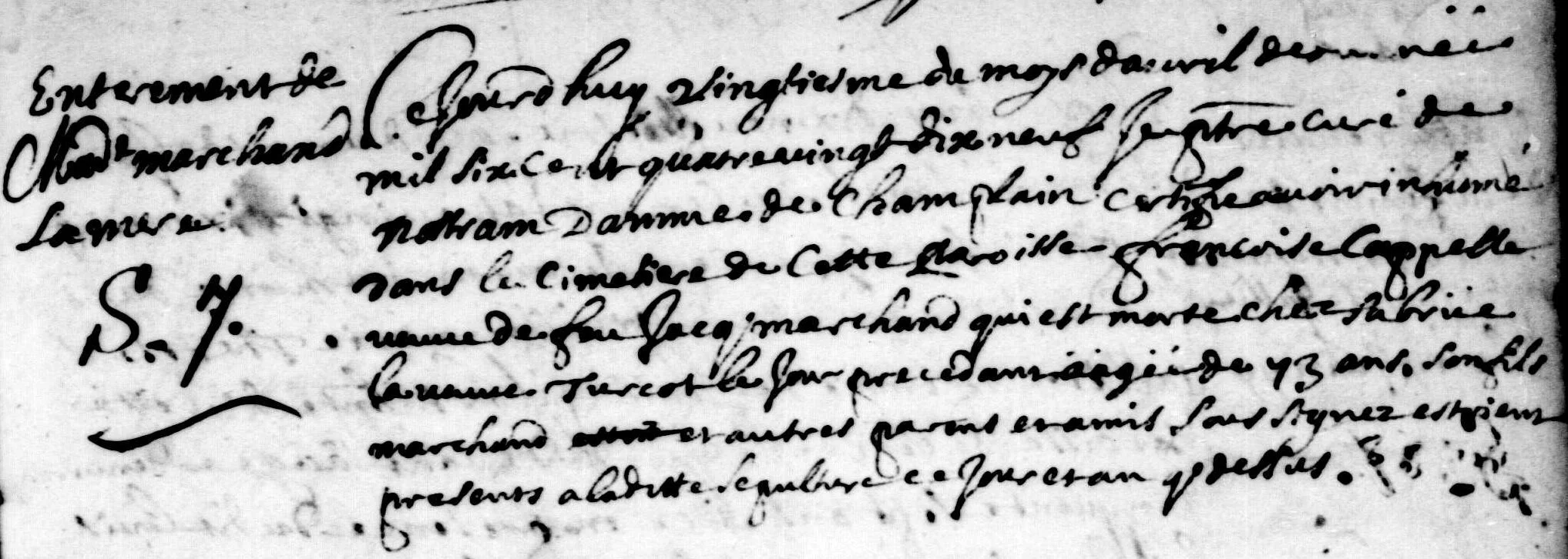 Sépulture de Jacques Marchand en 1695 (Généalogie Québec)
