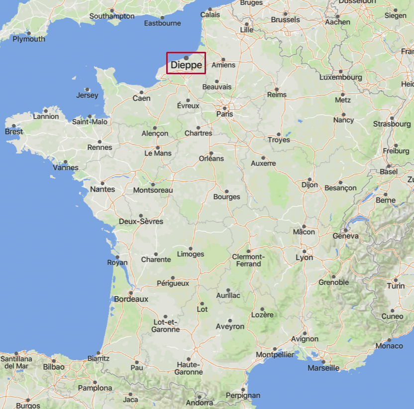 Dieppe se situe dans le nord du pays, dans le département de la Seine-Maritime. La ville compte aujourd’hui environ 30 000 habitants, les Dieppois. Port d’importance majeure, elle se distingue au XVIe siècle par sa contribution à l’école française de cartographie.