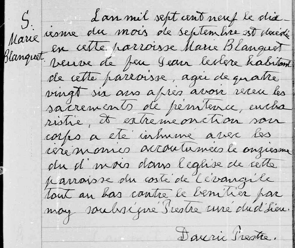 « Le LAFRANCE (Baptêmes, mariages et sépultures) », base de données et images numérisées, Généalogie Québec (https://www.genealogiequebec.com/Membership/LAFRANCE/acte/36999 : consultée le 28 août 2025), sépulture de Marie Blanquet, 11 sept. 1709, St-Pierre (Île d'Orléans) ; citant les données originales : Institut généalogique Drouin et le PRDH.