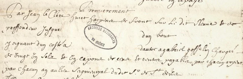 « Archives de notaires : Paul Vachon (1655-1693) », images numérisées, Bibliothèque et Archives nationales du Québec (https://numerique.banq.qc.ca/patrimoine/details/52327/4215635?docref=4RzH3bY5NWHAeN3Xeu2nJw : consultée le 28 août 2025), vente d’une concession de terre par Louis Juchereau à Jean Leclercq, 4 mars 1673, images 1025-1027 sur 1169.