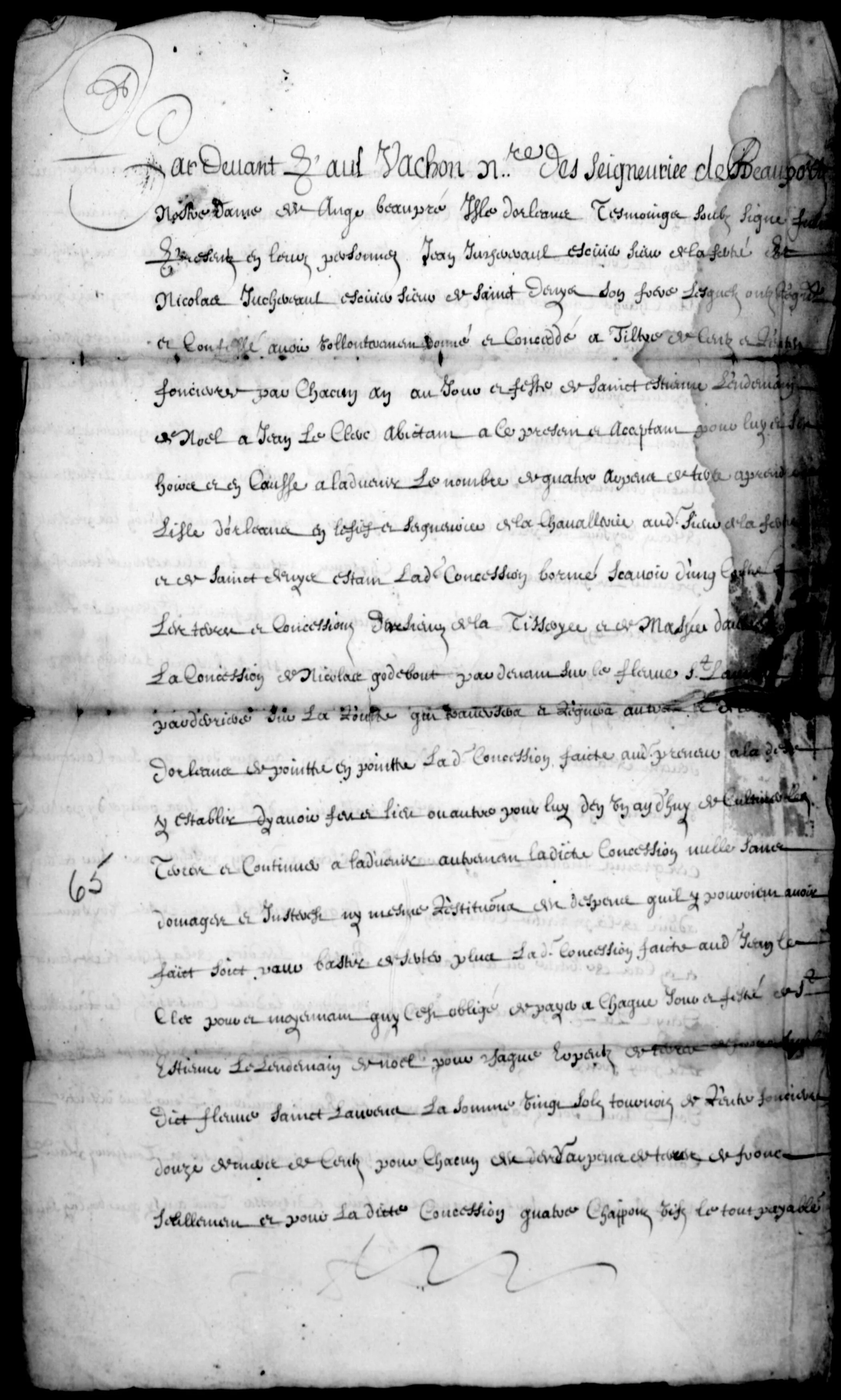 par Jean LeClerc huict harpents de front Sur Le dit fleuve Et de proffondeur Jusque [texte manquant] dun bout Joignant dun costé a [texte manquant] dautre a gabriel gosselin et Chargée de Vingt Ung Solz Et un capons de cens Et rents payable par chacun arpent par chacun an au lieu seigneurial dudit Sr de St denis.
