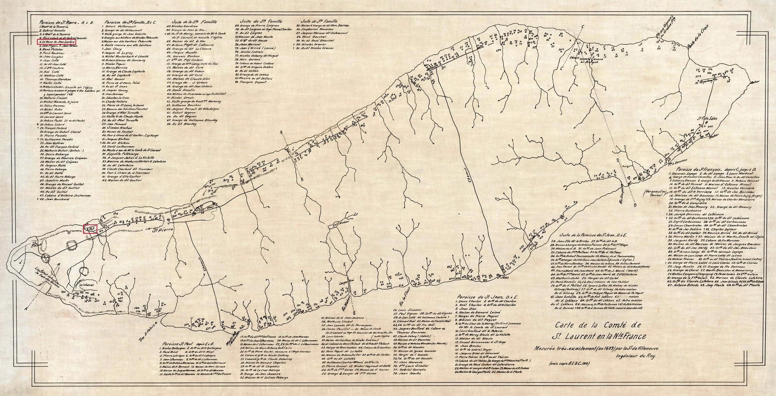 La carte de la seigneurie de l’Île-d’Orléans dessinée en 1689 par Robert de Villeneuve montre les terres de la famille Leclerc.