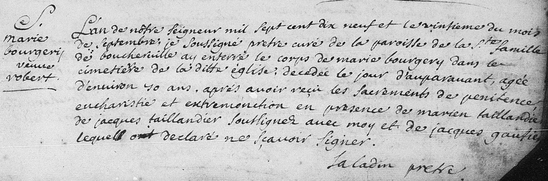 Marie Bourgery died two weeks later on September 25, 1719, at the age of 65, “after receiving the sacraments of Penance, the Eucharist, and Extreme Unction.” As she had requested, Marie was buried the following day in the Sainte-Famille parish cemetery in Boucherville. Notary Tailhandier dit LaBeaume attended her burial.