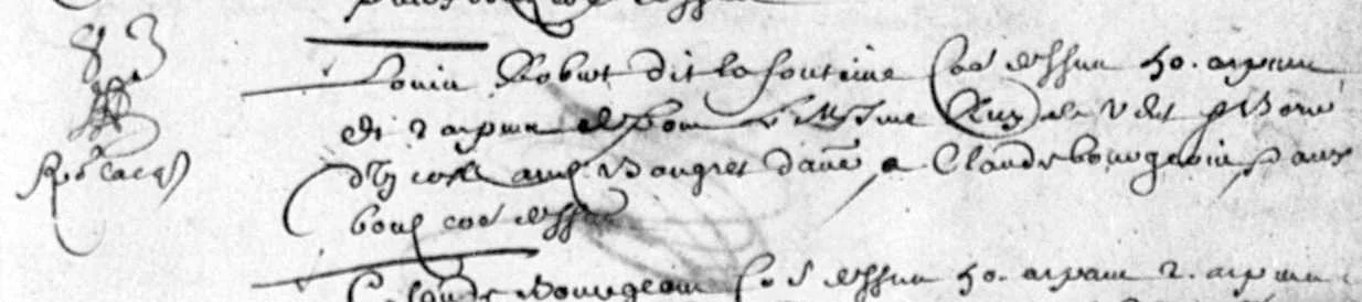 Louis is mentioned in a court case dated May 11, 1667. In a deposition, Jean Crevier, a 24-year-old inhabitant of Cap-de-la-Madeleine, reported illicit trading of alcohol with Indigenous people along the Trois-Rivières River during the previous winter. He stated that he saw a sergeant, a soldier, and Louis Robert dit Lafontaine each exchange a chopine d’eau-de-vie (a shot of brandy) for meat with Indigenous individuals. Crevier further alleged that such activity was common among soldiers in the area, noting that men from the garrison of Monsieur de Naurois frequently sought out Indigenous people to trade alcohol. While additional incidents involving others were described, Louis Robert’s role is limited to being personally observed engaging in one such exchange.
