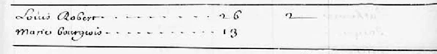 "Le LAFRANCE (Baptêmes, mariages et sépultures)," database and digital images, Généalogie Québec (https://www.genealogiequebec.com/Membership/LAFRANCE/acte/89067 : accessed 25 Apr 2026), marriage of Louis Robert and Marie Bourgeri, 25 Nov 1666, Trois-Rivières (Immaculée-Conception); citing original data: Institut généalogique Drouin and PRDH.