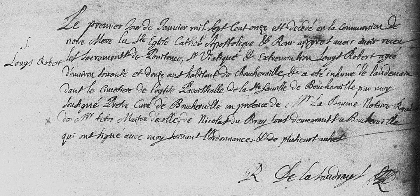 Louis Robert dit Lafontaine died at the age of 72 on January 1, 1711, “in communion with our Mother, the Holy Roman Catholic and Apostolic Church, after receiving the sacraments of Penance, Viaticum, and Extreme Unction.” He was buried the following day in the Sainte-Famille church cemetery of Boucherville, in the presence of many residents, including royal notary Marien Tailhandier dit LaBeaume.