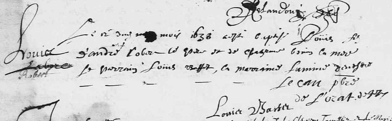 Louis’s parents, André Robert dit Lafontaine and Catherine Bonin, were married in the same parish on February 20, 1629. They had at least three other children, all baptized in the chapel of Sainte-Marguerite in La Rochelle: Jeanne (baptized 1630), René (baptized 1633), and Sébastienne (baptized 1637).