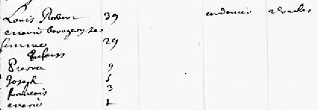 "Recensement du Canada, 1667," digital images, Library and Archives Canada (https://www.bac-lac.gc.ca/eng/CollectionSearch/Pages/record.aspx?app=fonandcol&IdNumber=2318857&new=-8585951843764033676 : accessed 26 Apr 2026), household of Louis Robert, 1667, Trois-Rivières, page 74 (of PDF), finding aid no. MSS0446, item ID number 2318857; citing original data: Centre des archives d'outre-mer (France) vol. 460.