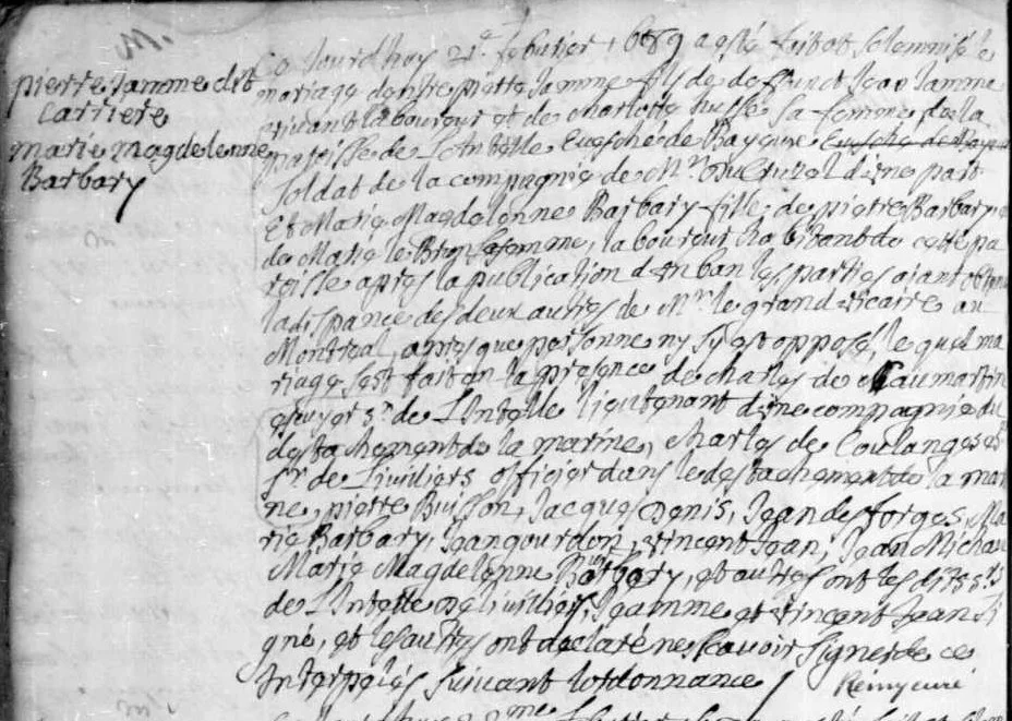 "Le LAFRANCE (Baptêmes, mariages et sépultures)," database and digital images, Généalogie Québec (https://www.genealogiequebec.com/Membership/LAFRANCE/acte/14296 : accessed 30 Mar 2024), marriage of Pierre Jamme and Marie Madeleine Barbary, 21 Feb 1689, Montréal, Lachine (Sts-Anges) ; citing original data : Collection Drouin, Institut généalogique Drouin.