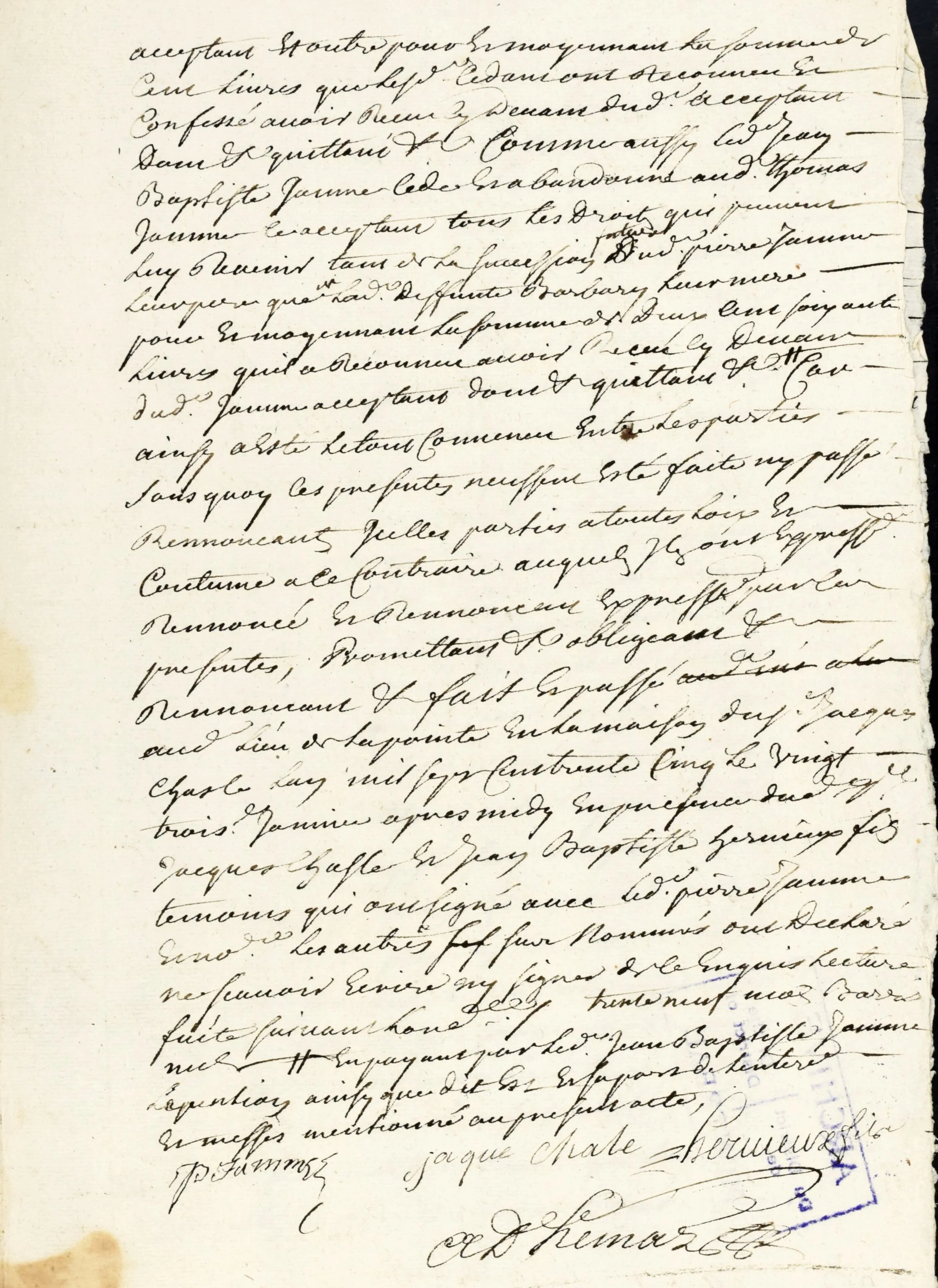 Last page of the 1735 agreement between Pierre Jamme dit Carrière and his children (Bibliothèque et Archives nationales du Québec)