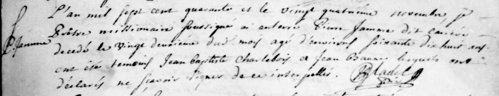 "Le LAFRANCE (Baptêmes, mariages et sépultures)," database and digital images, Généalogie Québec https://www.genealogiequebec.com/Membership/LAFRANCE/acte/118304 : accessed 31 Mar 2024), burial of Pierre Jamme dit Carrière, 24 Nov 1740, Pointe-Claire (St-Joachim) ; citing original data : Collection Drouin, Institut généalogique Drouin.