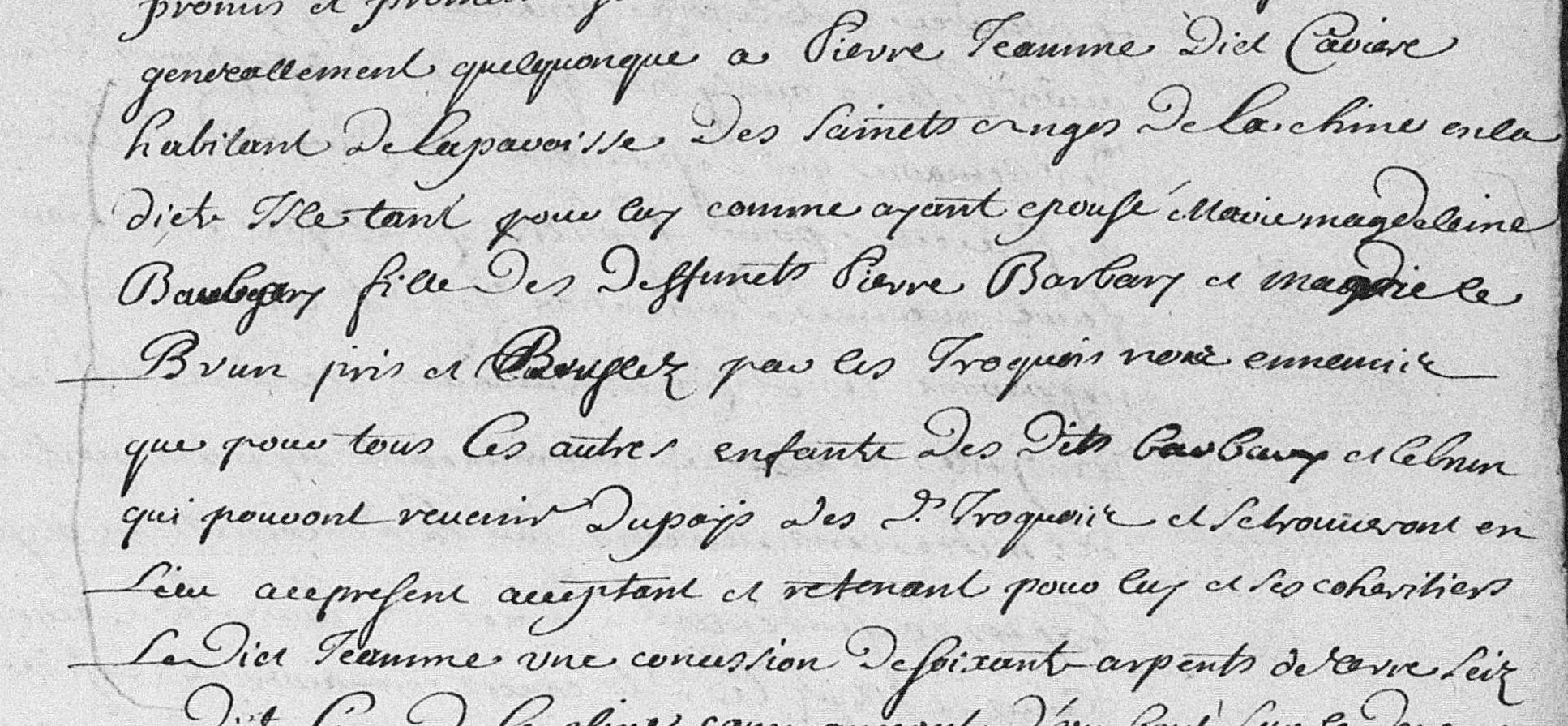 "Actes de notaire : Jean-Baptiste Pottier : 1686-1701," digital images, FamilySearch (https://www.familysearch.org/ark:/61903/3:1:3QHV-L3VW-V97Y-Q?i=1473&cat=529326 : accessed 30 Mar 2024), land concession by the Séminaire de St-Sulpice de Montréal to Pierre Jeamme dit Cariere and Marie-Madeleine Barbary, 23 Jan 1698; citing original data : Bibliothèque et Archives nationales du Québec.
