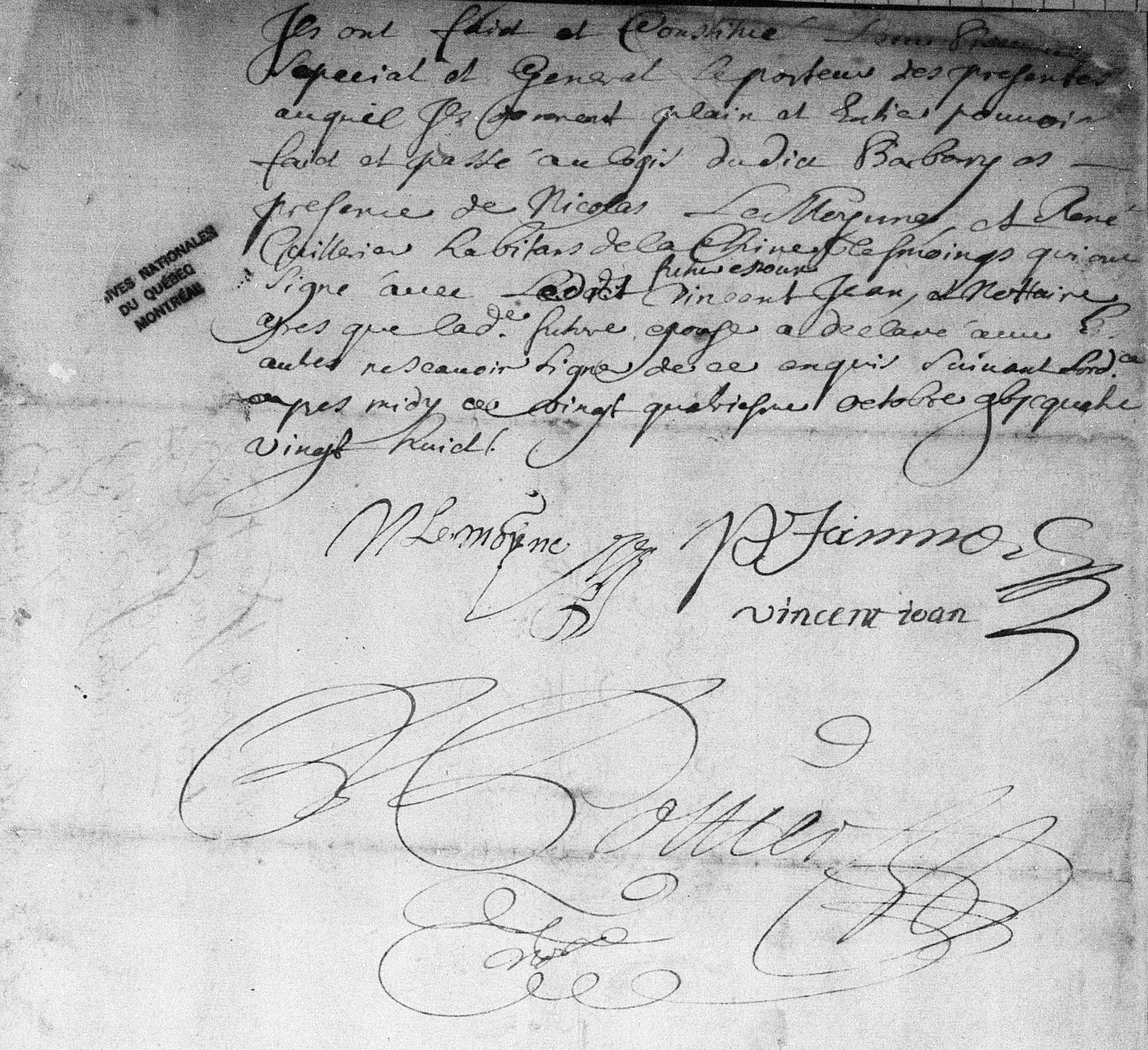 "Actes de notaire : Jean-Baptiste Pottier : 1686-1701," digital images, FamilySearch (https://www.familysearch.org/ark:/61903/3:1:3QHV-P3VW-VB54?i=832&cat=529326 : accessed 30 Mar 2024), marriage contract between Pierre Jamme dit Lacarriere and Marie-Madeleine Barbary, 24 Oct 1688; citing original data : Bibliothèque et Archives nationales du Québec.