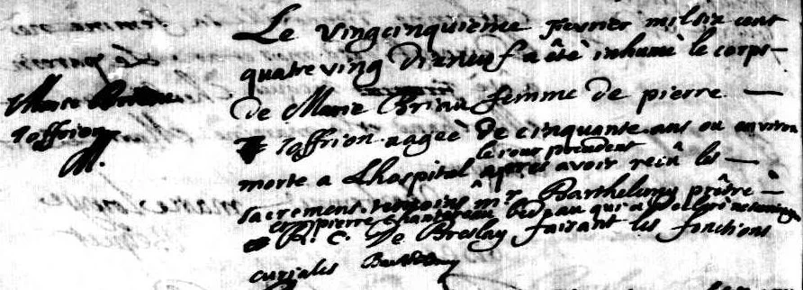 Marie Briault (or Priault) died first, on February 24, 1699, at the Montreal hospital. She was buried the next day in Montreal, although her place of burial is not specified (parish cemetery, hospital cemetery, church). The record indicates that she was "aged fifty years or thereabouts."