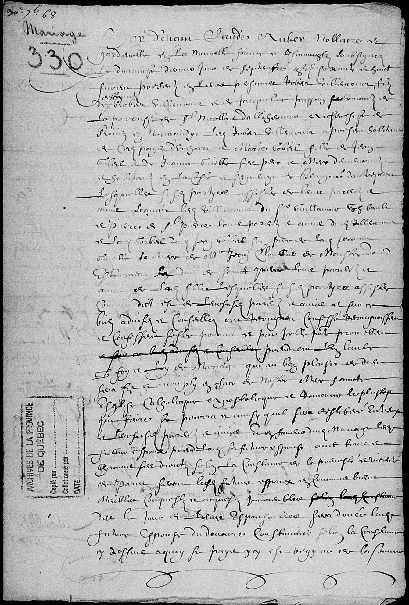 - « Actes de notaire, 1652-1692 // Claude Auber », images numérisées, FamilySearch (https://www.familysearch.org/ark:/61903/3:1:3QHV-53L2-61KN?i=875&cat=1175225 : consulté le 29 juil. 2025), contrat de mariage de Robert Villancourt et Marie Gobeil, 30 sept. 1668, images 876-877 sur 1368 ; citant les données originales : Bibliothèque et Archives nationales du Québec.